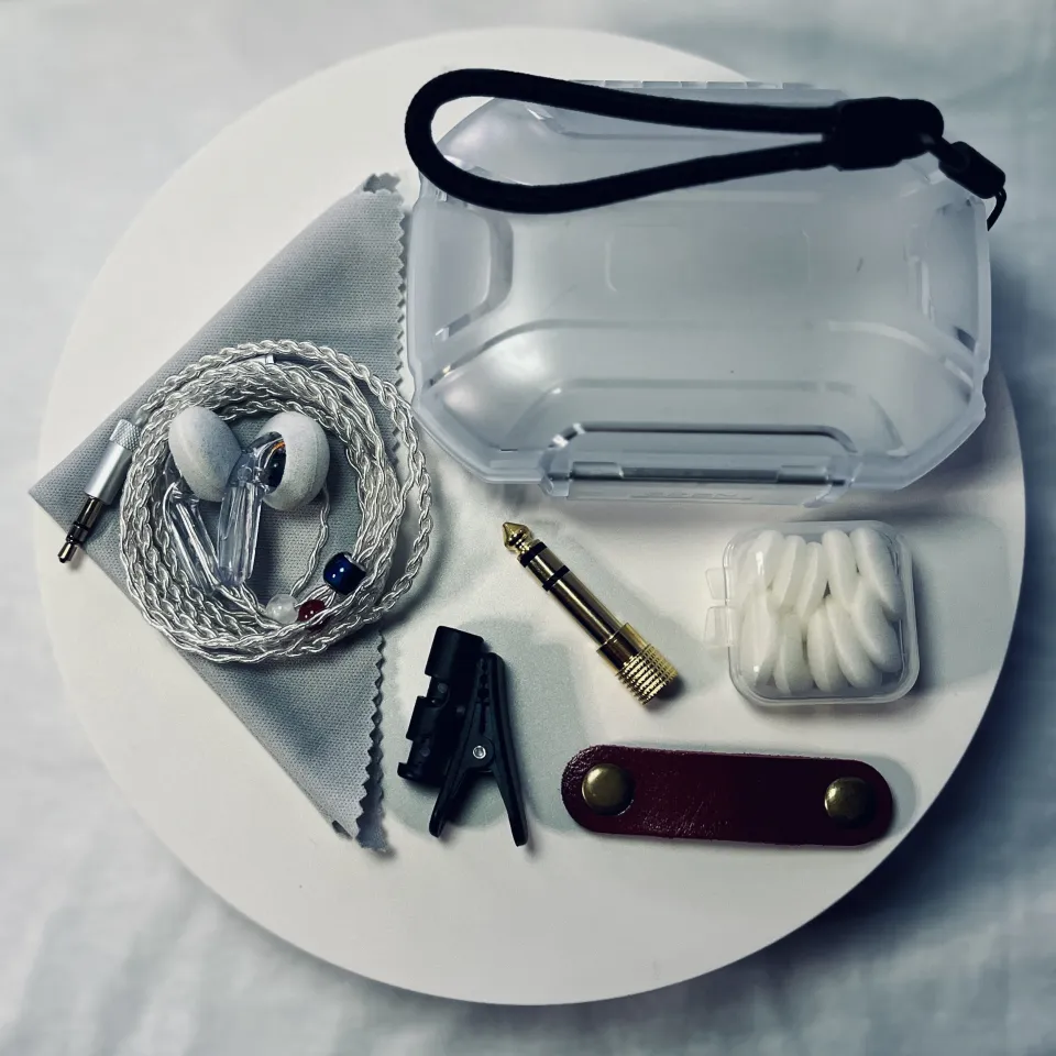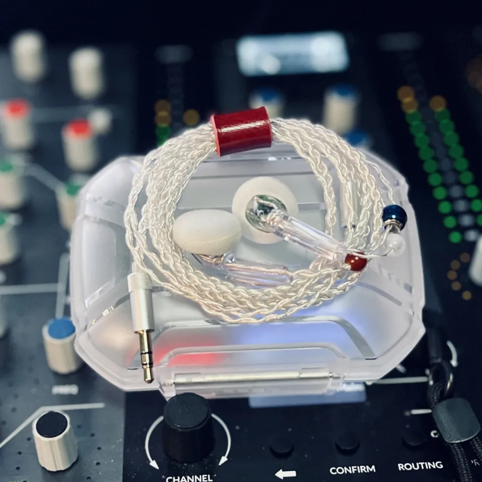 FLATLINE earbuds depicted are shown in 'Founders' Edition' colours of white cables, white and red left/right semiprecious gem indicator beads, and clear shells. Contact us if you would like to know your customization options, buy a pair, or reserve a time to try our demo unit. Price subject to change if you want a nonstandard build.